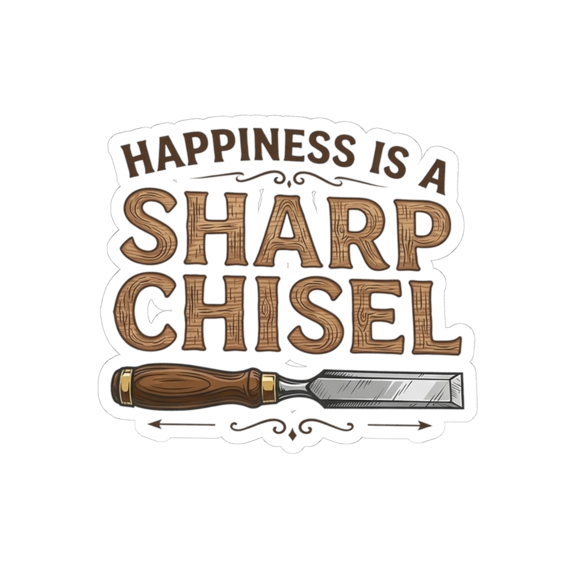 - Die-cut vinyl sticker featuring the Happiness is a Sharp Chisel graphic